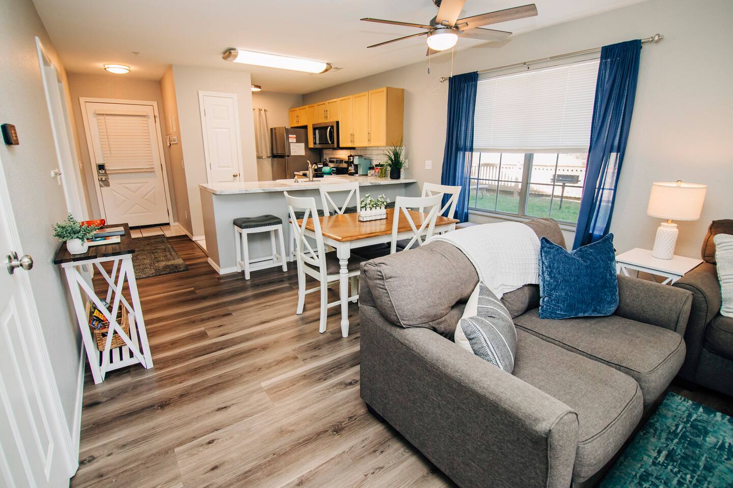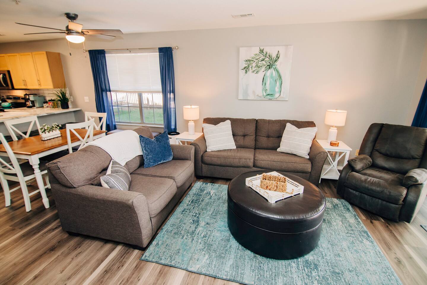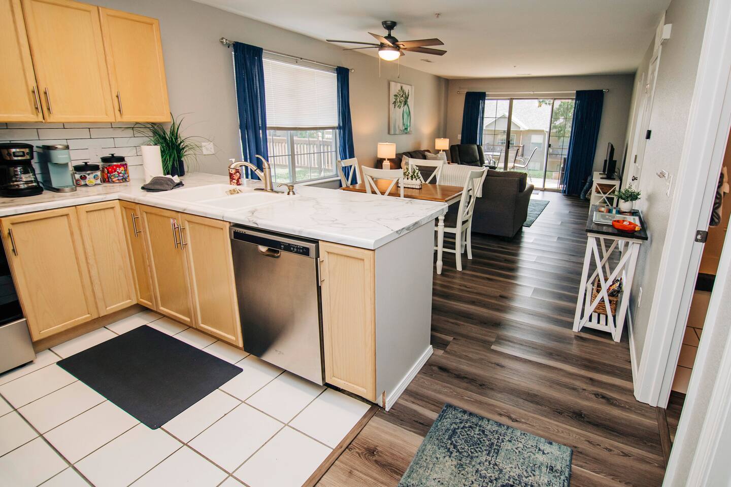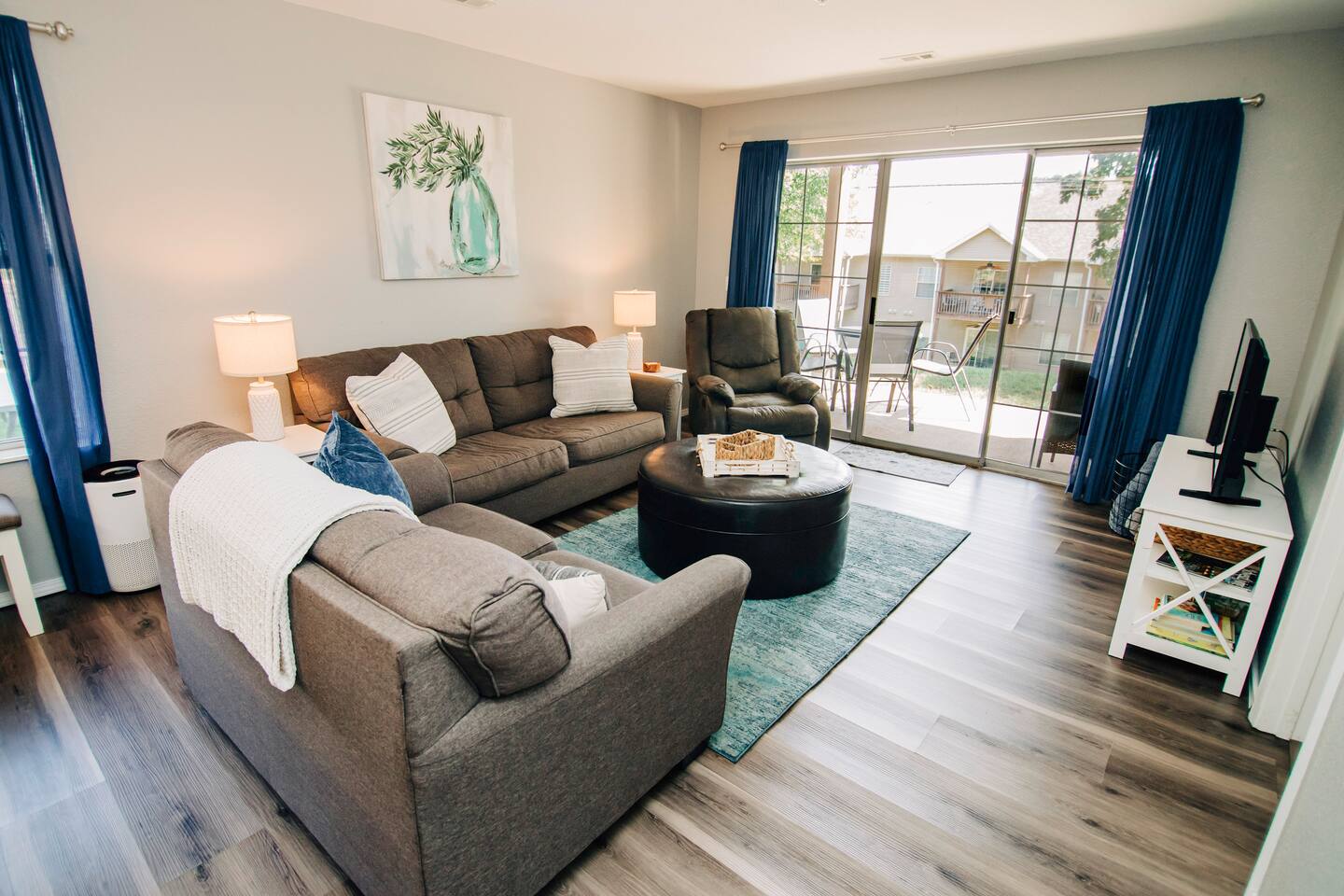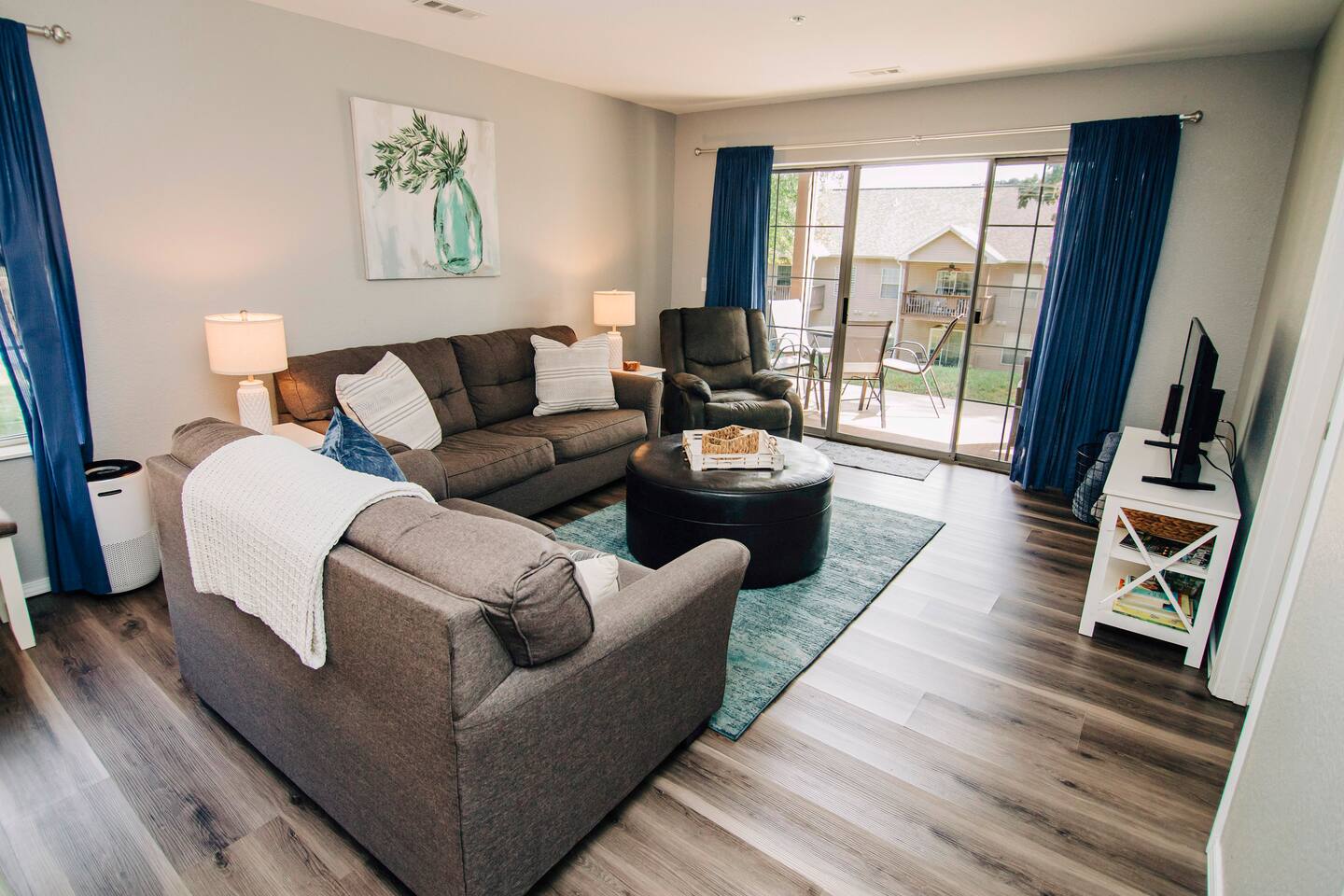 Whether you're looking to unwind or dive into the excitement of the area, you'll find everything just a stone's throw away. A short stroll brings you to Fall Creek Marina on Lake Taneycomo - perfect for fishing, kayaking, or soaking in the view! Moonshine Beach and the Table Rock Dam are just around the corner. Head the other way, and in just minutes you'll find yourself on the famous 76 Strip where entertainment, shopping, and dining await. Also, just 15 minutes to Silver Dollar City and 20 minutes to world-class golf. Our Space: ~ Bedroom 1: Has a King size bed, a smart TV, a full-size closet to hang up your clothes, and an ensuite bathroom with a large vanity and shower/tub combo. ~ Bedroom 2: Has a full-size bed with a full-size trundle bed below, a smart TV, and a full-size closet where you will find stored a pack 'n play, stroller, and highchair. ~ Living Room: 1 Sofa Bed • Rest easy with fresh bedding and towels provided for your comfort • 2 full bathrooms with tub/shower combos • Bath essentials provided • Fully equipped kitchen to make meal prep a breeze • Dishwasher, cookware, utensils (kid friendly plates & cups provided) • In-unit washer and dryer • Parking for up to 2 vehicles ****Please note, that while this condo is on the bottom floor, access from the parking lot does require stairs. There is parking at the opposite end of the building (about a 60-yard walk) with only 2 stairs to get to the bottom floor.****