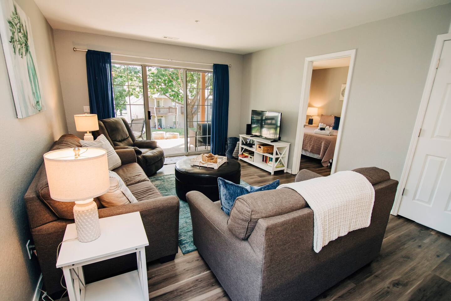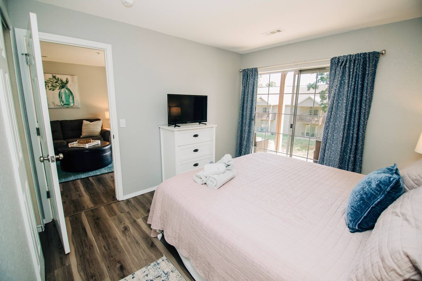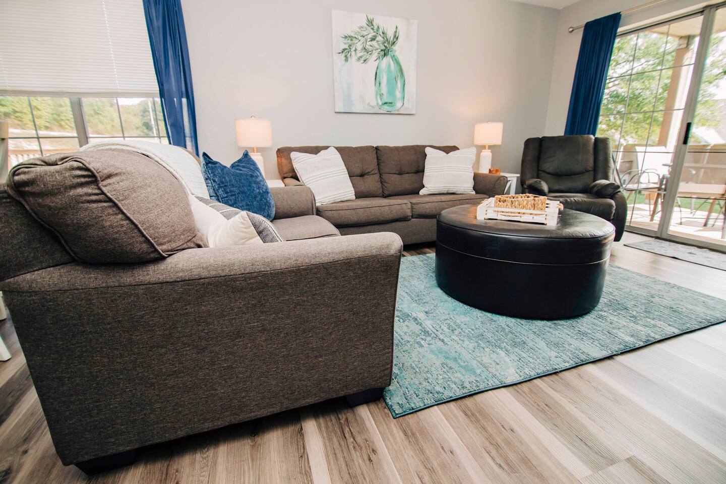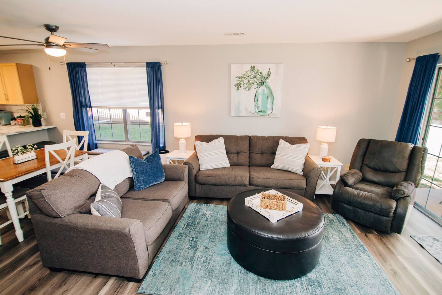 Whether you're looking to unwind or dive into the excitement of the area, you'll find everything just a stone's throw away. A short stroll brings you to Fall Creek Marina on Lake Taneycomo - perfect for fishing, kayaking, or soaking in the view! Moonshine Beach and the Table Rock Dam are just around the corner. Head the other way, and in just minutes you'll find yourself on the famous 76 Strip where entertainment, shopping, and dining await. Also, just 15 minutes to Silver Dollar City and 20 minutes to world-class golf. Our Space: ~ Bedroom 1: Has a King size bed, a smart TV, a full-size closet to hang up your clothes, and an ensuite bathroom with a large vanity and shower/tub combo. ~ Bedroom 2: Has a full-size bed with a full-size trundle bed below, a smart TV, and a full-size closet where you will find stored a pack 'n play, stroller, and highchair. ~ Living Room: 1 Sofa Bed • Rest easy with fresh bedding and towels provided for your comfort • 2 full bathrooms with tub/shower combos • Bath essentials provided • Fully equipped kitchen to make meal prep a breeze • Dishwasher, cookware, utensils (kid friendly plates & cups provided) • In-unit washer and dryer • Parking for up to 2 vehicles ****Please note, that while this condo is on the bottom floor, access from the parking lot does require stairs. There is parking at the opposite end of the building (about a 60-yard walk) with only 2 stairs to get to the bottom floor.****