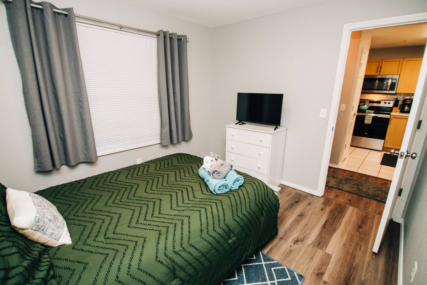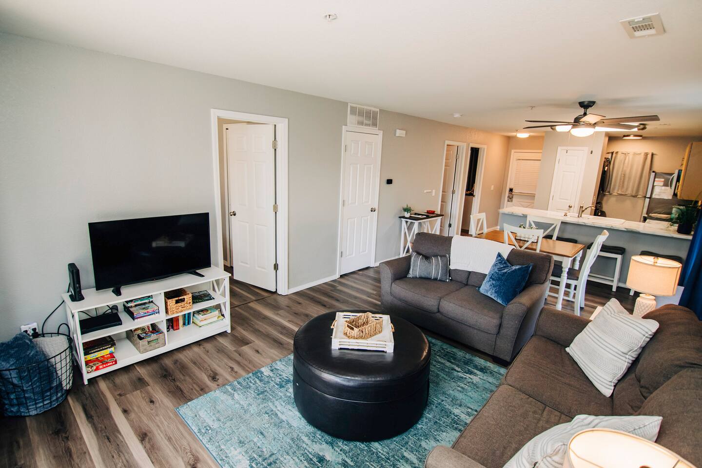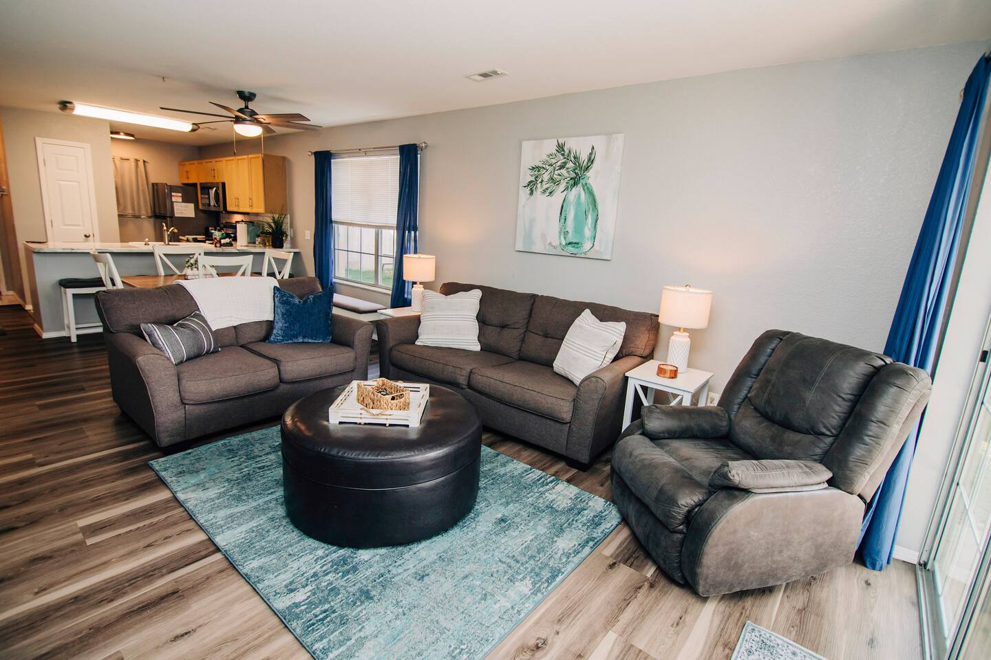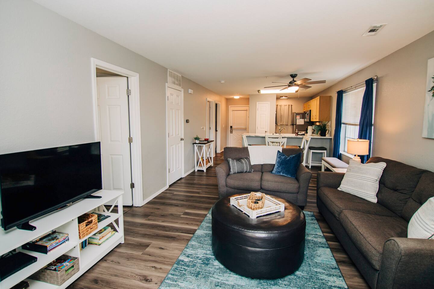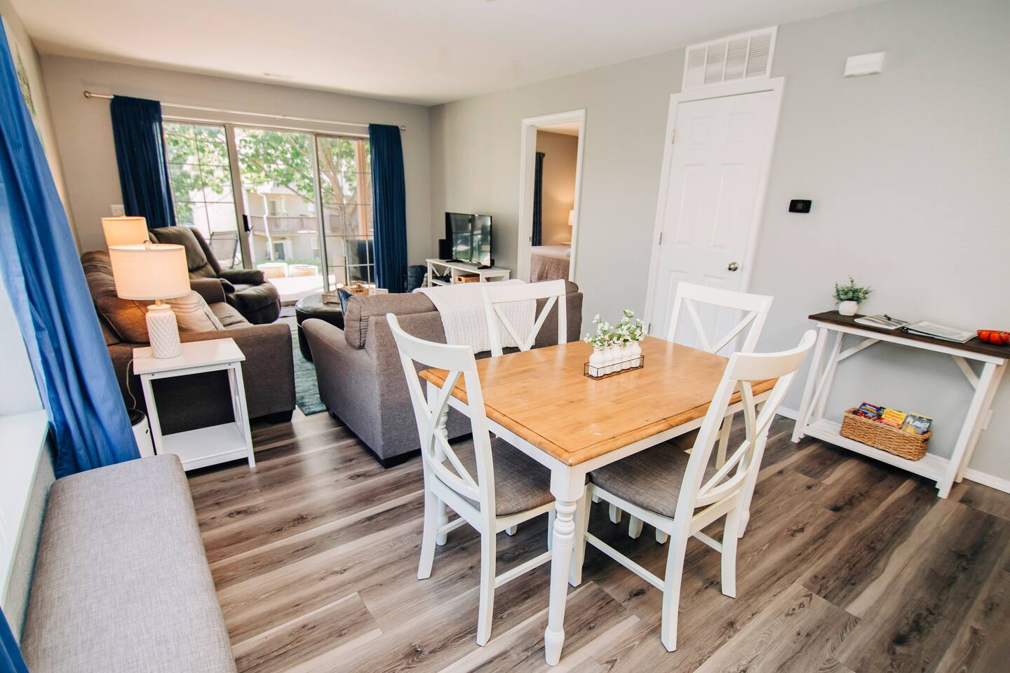 Whether you're looking to unwind or dive into the excitement of the area, you'll find everything just a stone's throw away. A short stroll brings you to Fall Creek Marina on Lake Taneycomo - perfect for fishing, kayaking, or soaking in the view! Moonshine Beach and the Table Rock Dam are just around the corner. Head the other way, and in just minutes you'll find yourself on the famous 76 Strip where entertainment, shopping, and dining await. Also, just 15 minutes to Silver Dollar City and 20 minutes to world-class golf. Our Space: ~ Bedroom 1: Has a King size bed, a smart TV, a full-size closet to hang up your clothes, and an ensuite bathroom with a large vanity and shower/tub combo. ~ Bedroom 2: Has a full-size bed with a full-size trundle bed below, a smart TV, and a full-size closet where you will find stored a pack 'n play, stroller, and highchair. ~ Living Room: 1 Sofa Bed • Rest easy with fresh bedding and towels provided for your comfort • 2 full bathrooms with tub/shower combos • Bath essentials provided • Fully equipped kitchen to make meal prep a breeze • Dishwasher, cookware, utensils (kid friendly plates & cups provided) • In-unit washer and dryer • Parking for up to 2 vehicles ****Please note, that while this condo is on the bottom floor, access from the parking lot does require stairs. There is parking at the opposite end of the building (about a 60-yard walk) with only 2 stairs to get to the bottom floor.****